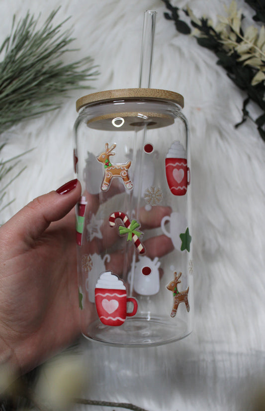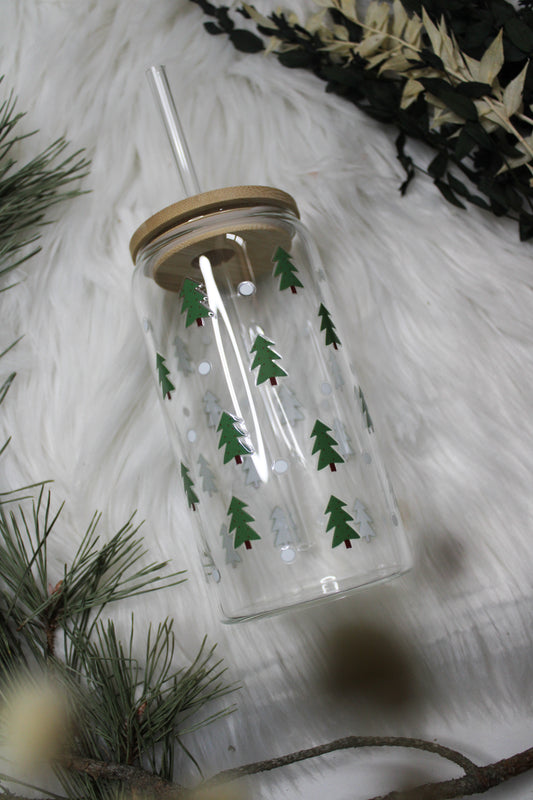 Glas mit Deckel & Strohhalm „Tannenbäume“