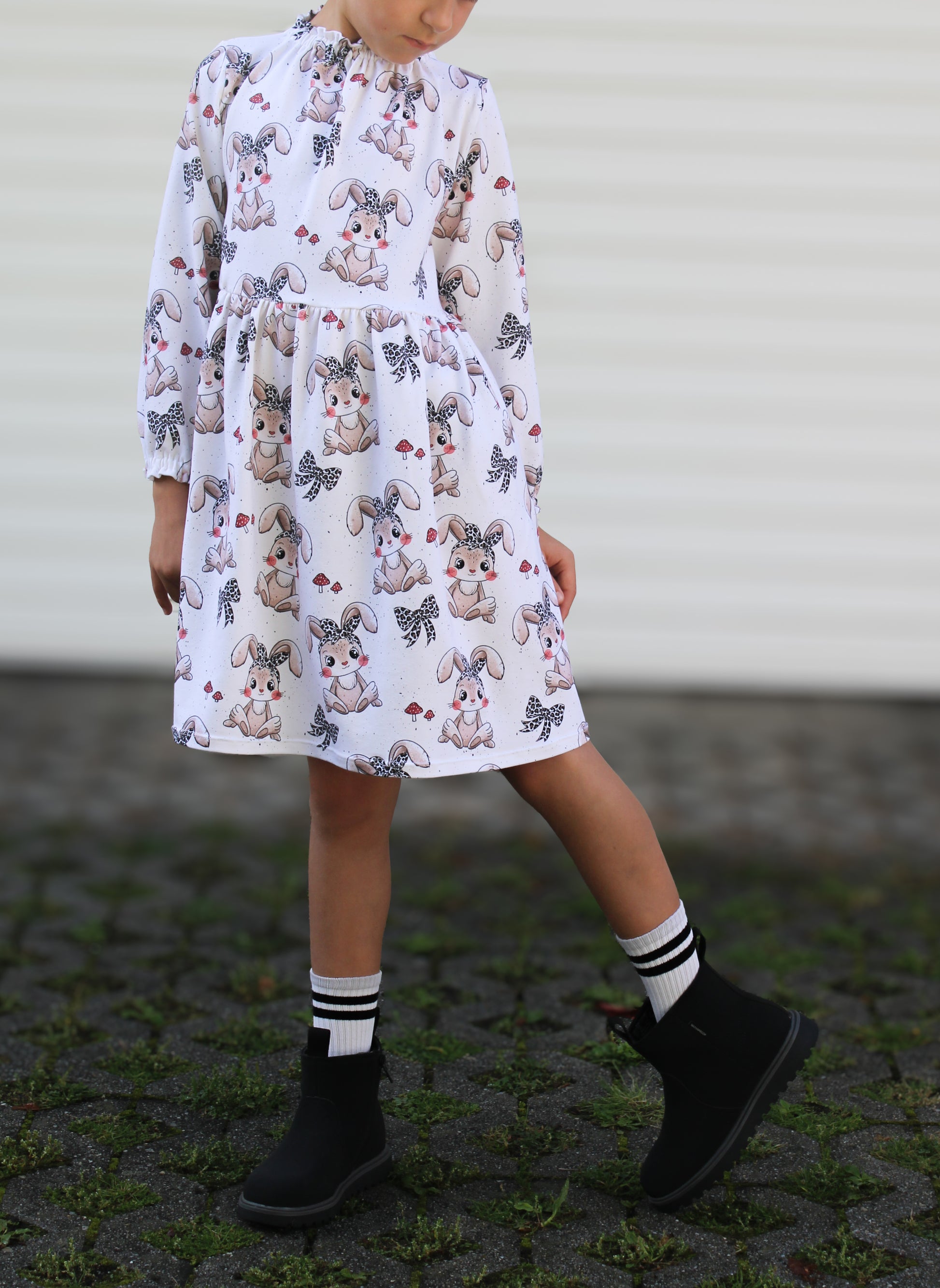 Kleid Mia ist hinten länger geschnitten als vorne. Es hat lange Ärmel. Es ist leicht gerafft und fällt dadurch besonders schön.