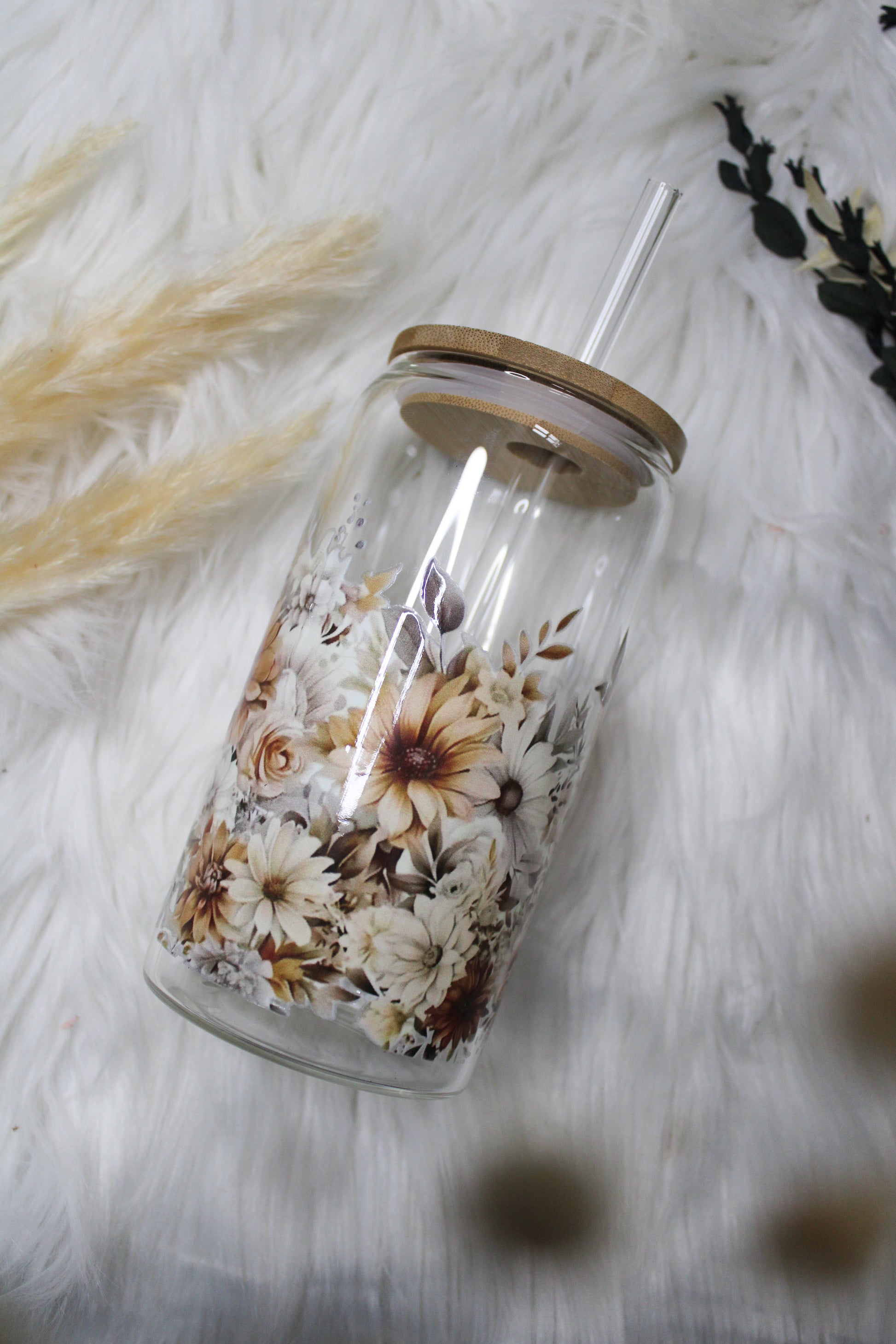 Glas mit Deckel & Strohhalm „Blumen beige“