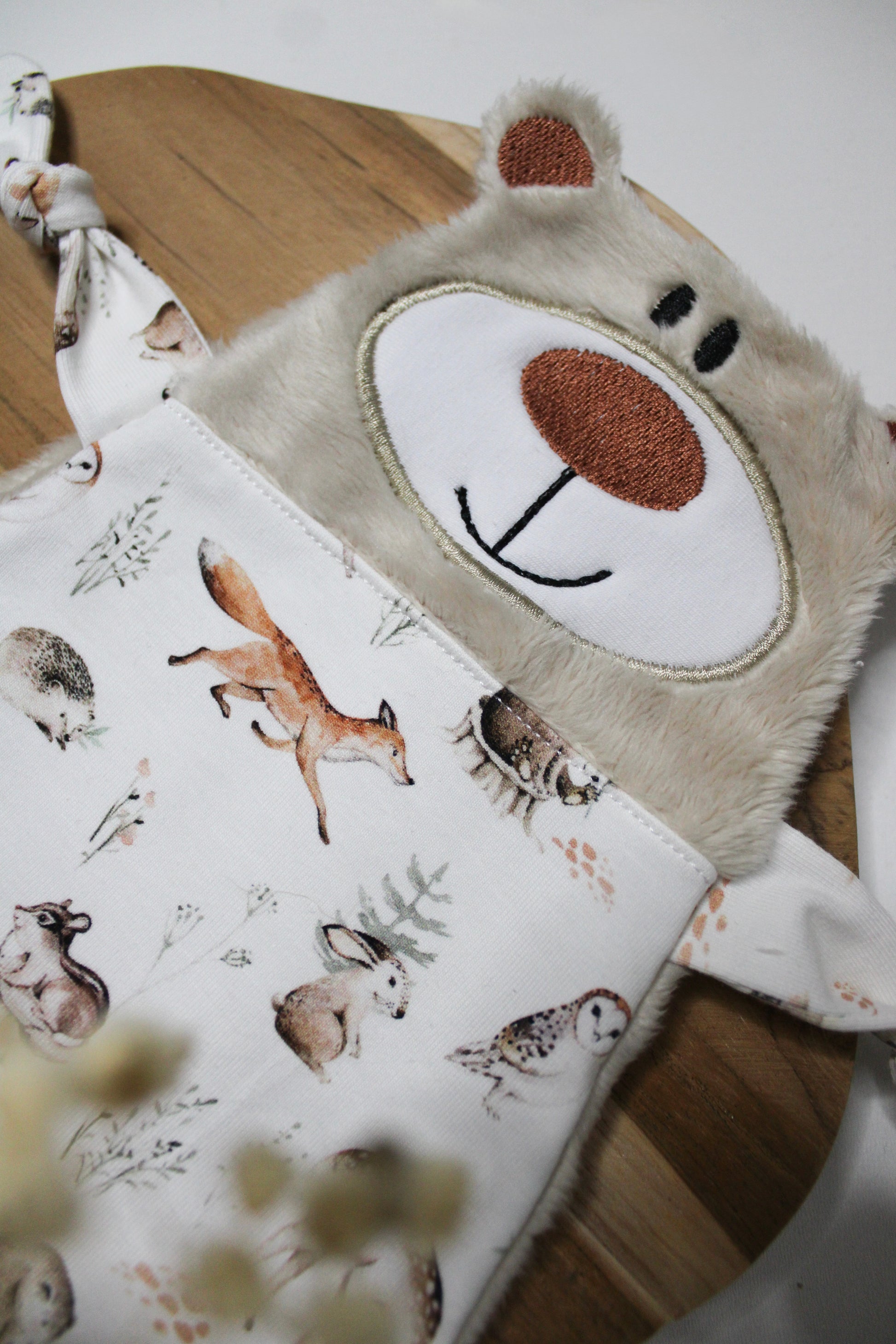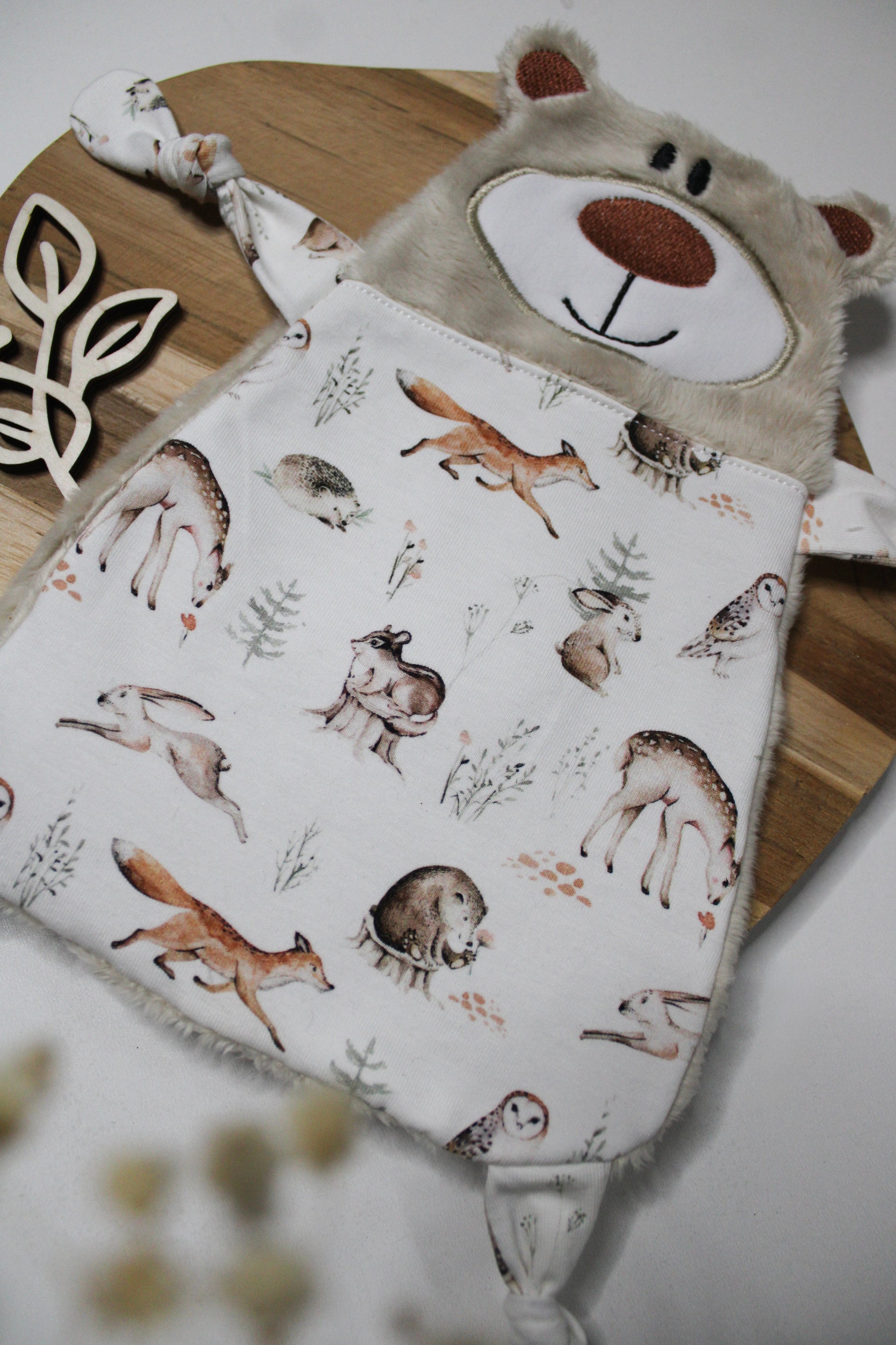 Dieses liebevoll handgefertigte Kuscheltuch ist der ideale Begleiter für Babys und Kleinkinder. Mit seinem süßen Bärchen-Kopf, den weichen Materialien und den niedlichen Tieren sorgt es für Geborgenheit, Trost und viele kuschelige Momente.