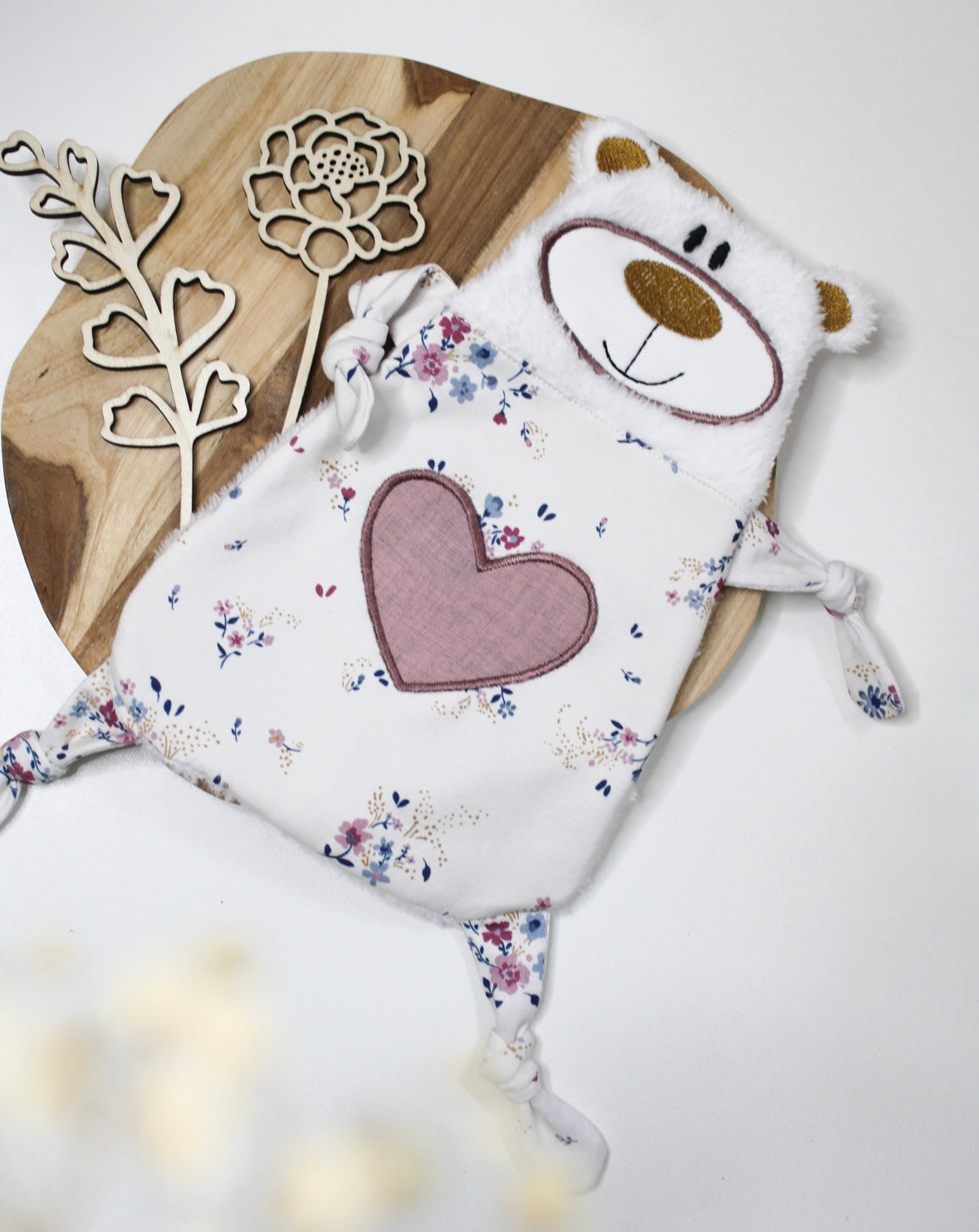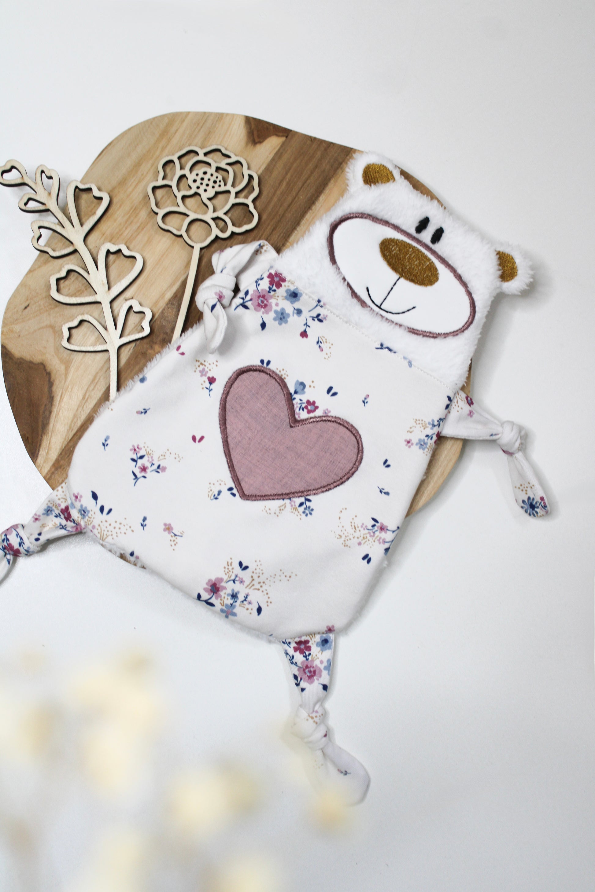 Dieses liebevoll handgefertigte Kuscheltuch ist der ideale Begleiter für Babys und Kleinkinder. Mit seinem süßen Bärchen-Kopf, den weichen Materialien und den floralen Muster sorgt es für Geborgenheit, Trost und viele kuschelige Momente.