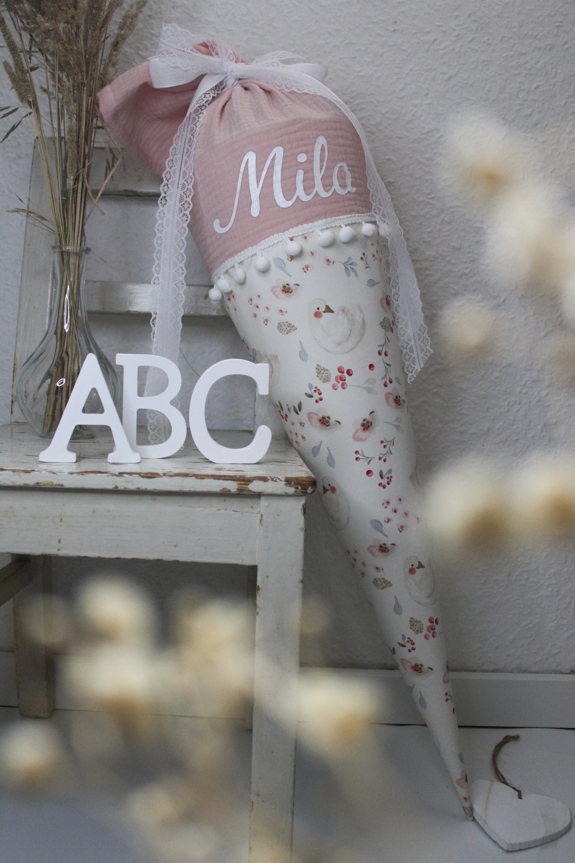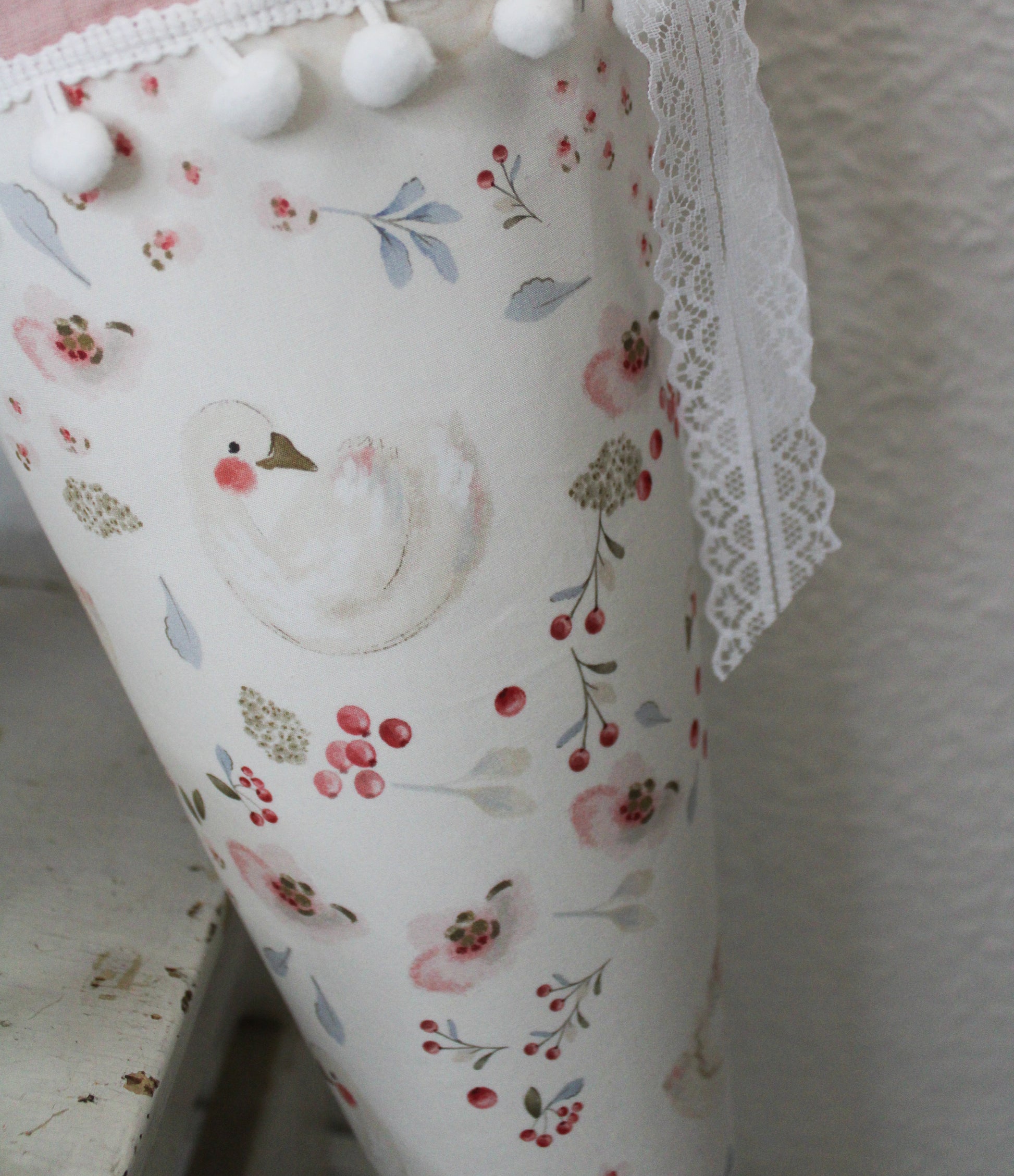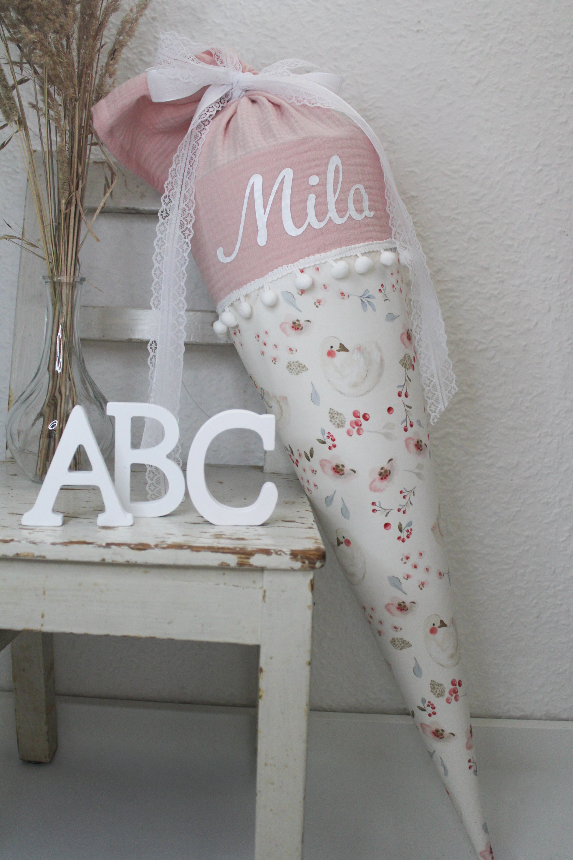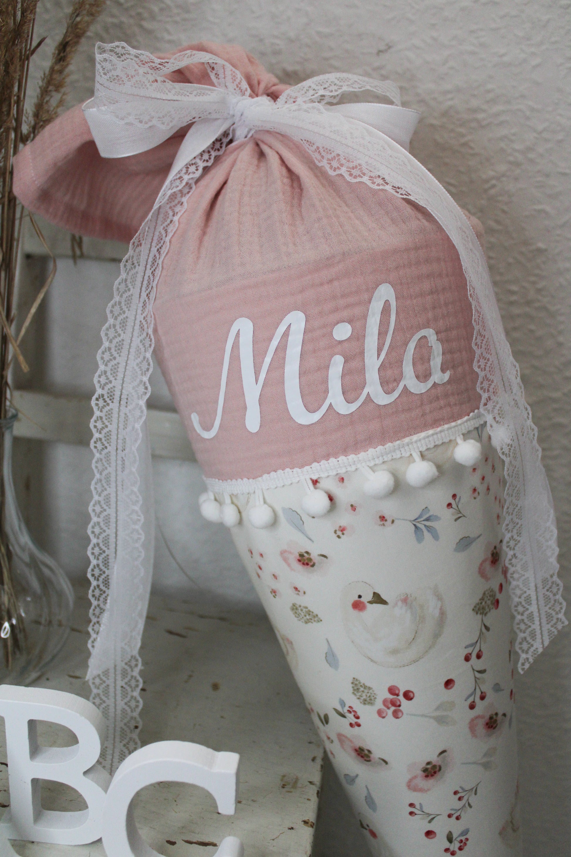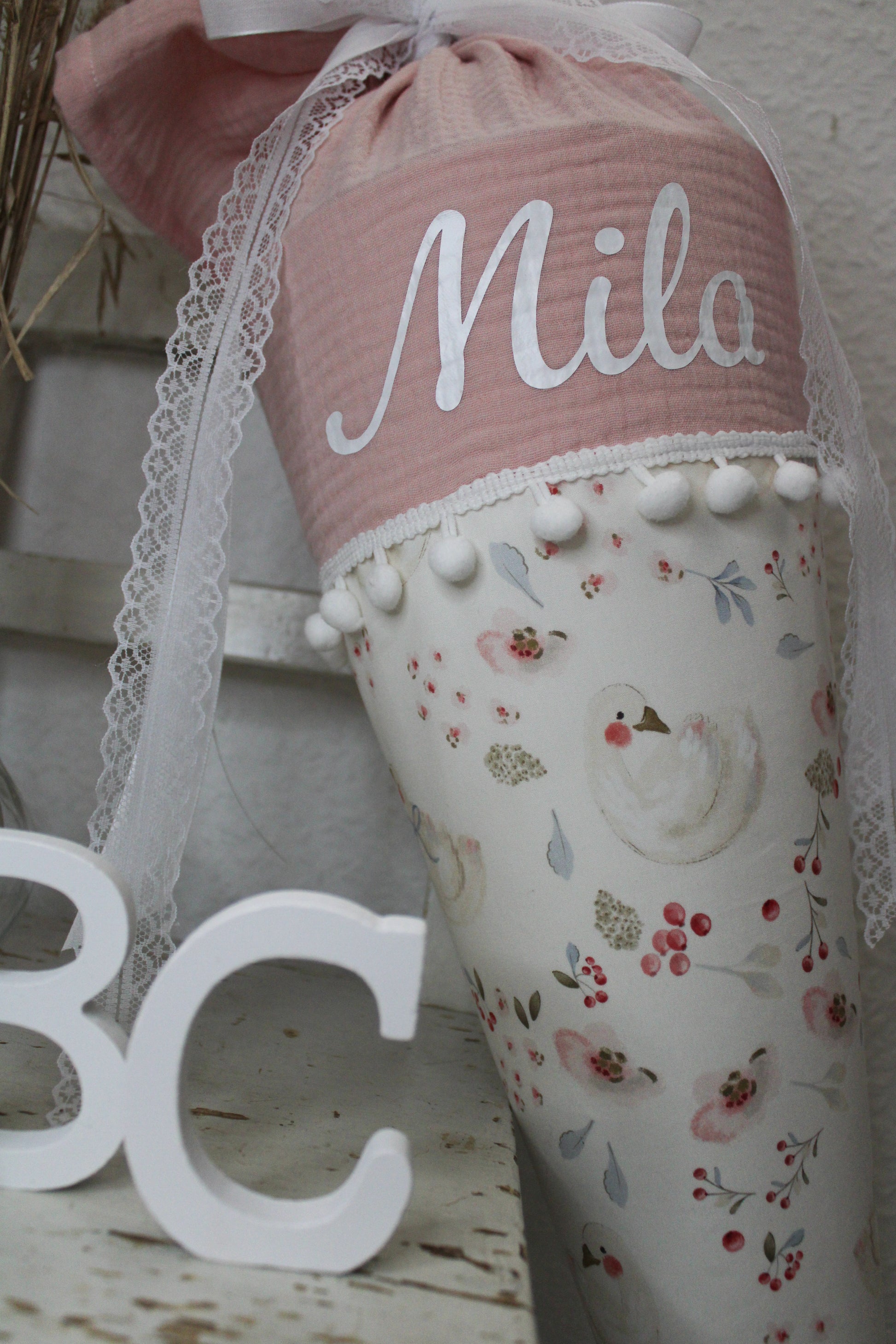 Hier bekommst du eine runde Schultüte mit zuckersüßen Schwänen mit Blumen und rosa Musselin.
